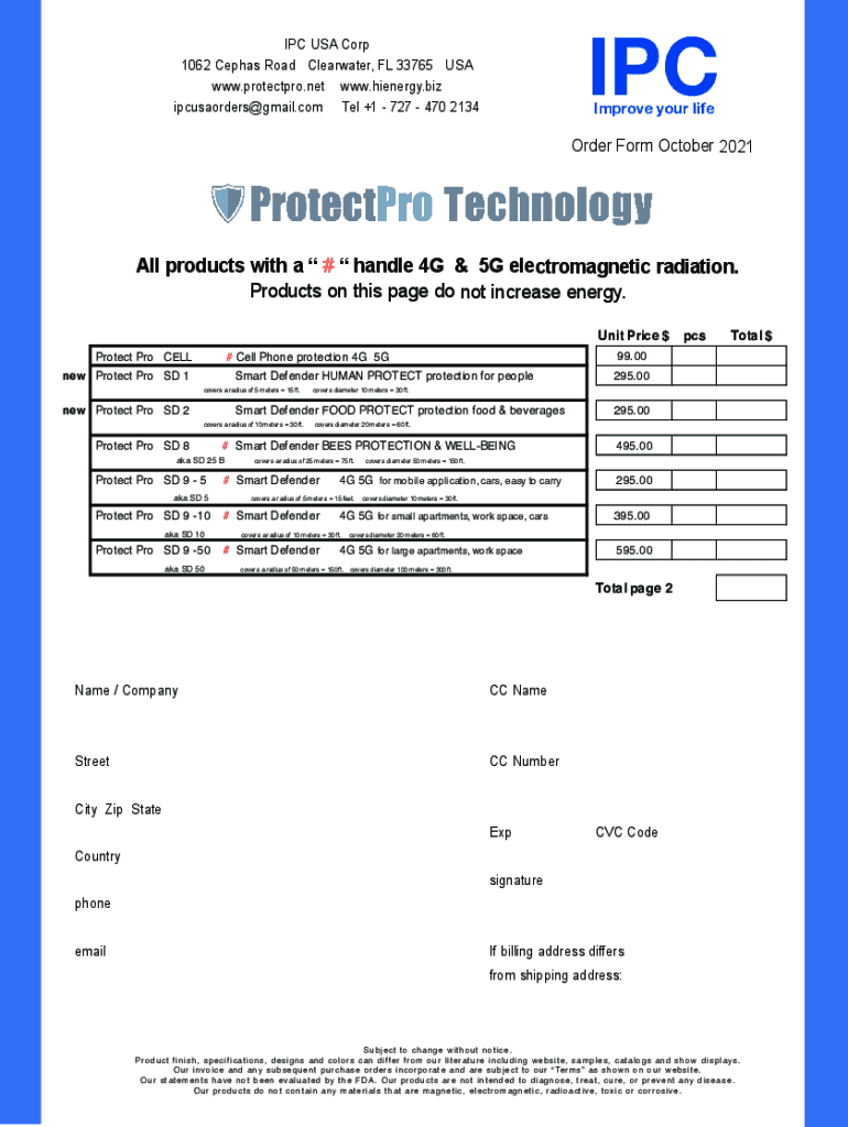 IPC USA Corp 1062 Cepheid Road Clearwater, FL 33765 USA www.protectpro.net www.hienergy.biz ipcusaorders×gmail.com Tel +1 727 470 2134Order Form October 2021All products with a # handle 4G & 5G electromagnetic
