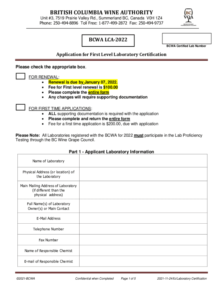 BRITISH COLUMBIA WINE AUTHORITY Unit #3, 7519 Prairie Valley Rd., Summer land BC, Canada V0H 1Z4 Phone: 2504948896 Toll Free: 18774992872 Fax: 2504949737BCWA LCA2022 CWA Certified Lab NumberApplication