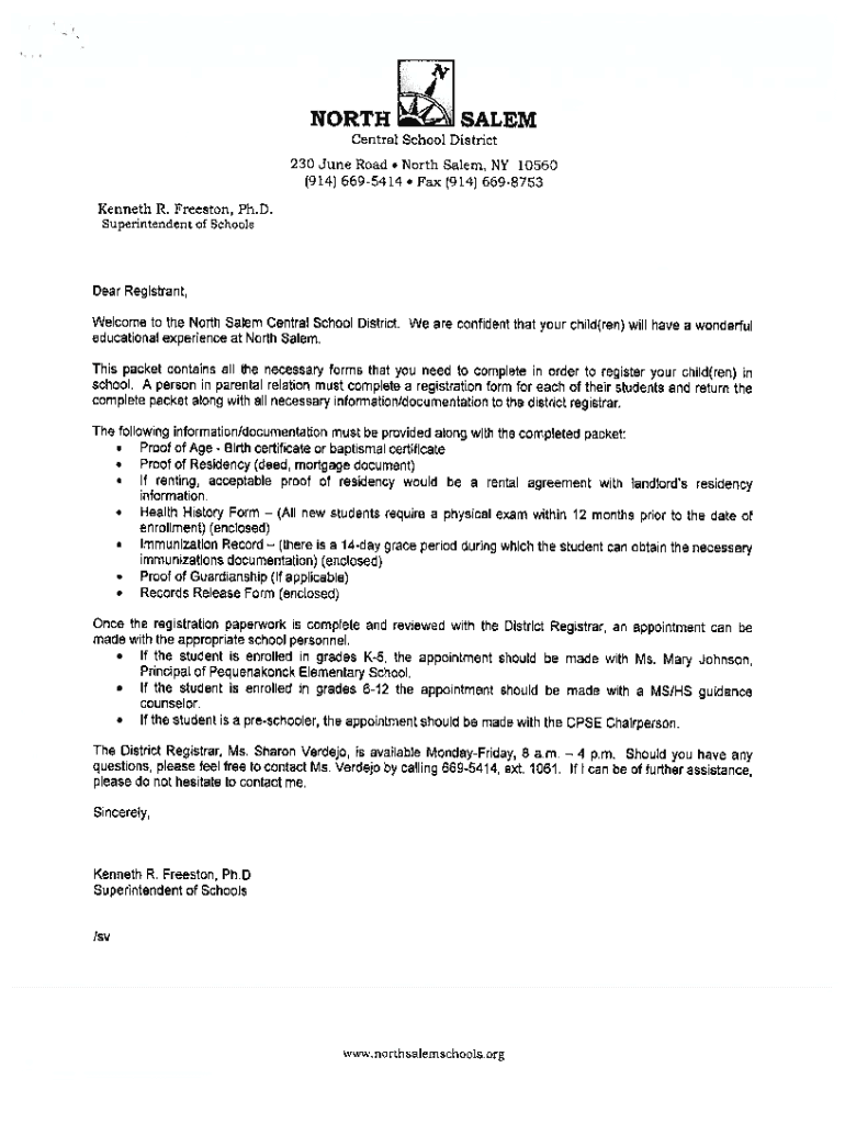 NORTH SALEMCentral School District 230 June Road North Salem, NY 10560 ×914× 6695414 Fax (914) 6698753Kenneth R. Freestone, Ph.D. Superintendent of Schoolmate Registrant, Welcome to the North Salem