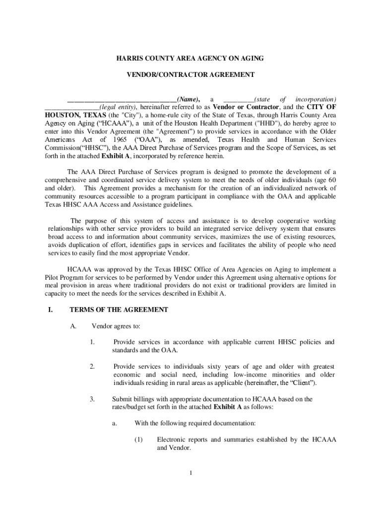 HARRIS COUNTY AREA AGENCY ON AGING VENDOR×CONTRACTOR AGREEMENT___(Name×, a ___(state of incorporation) ___(legal entity×, hereinafter referred to as Vendor or Contractor, and the CITY OF HOUSTON,