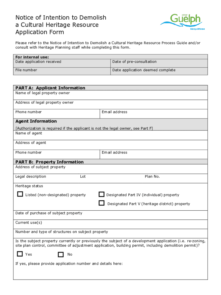 Notice of Intention to Demolish a Cultural Heritage Resource Application Form Please refer to the Notice of Intention to Demolish a Cultural Heritage Resource Process Guide and×or consult with Heritage