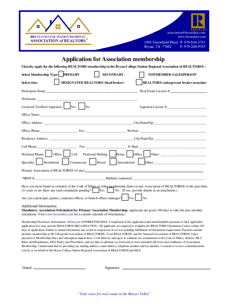 Association×bcsrealtor.com www.bcsrealtor.com1901 Greenfield Plaza P: 9798463751 Bryan, TX 77802 F: 9792609765Application for Association membership I hereby apply for the following REALTOR membership