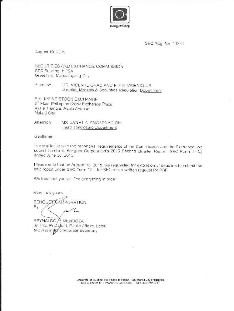 BenguetcorpSEC Reg No1134jAugusl 19 2015SECUR T×ES AND EXCHANGE COMM SS ON SEC Building ESA G, Kerr, rt Va×Oahu, o\' g \'r, AtlentonMR VICENTE Graciano P Fell×Enid, JR D actor LY\'markets & Security