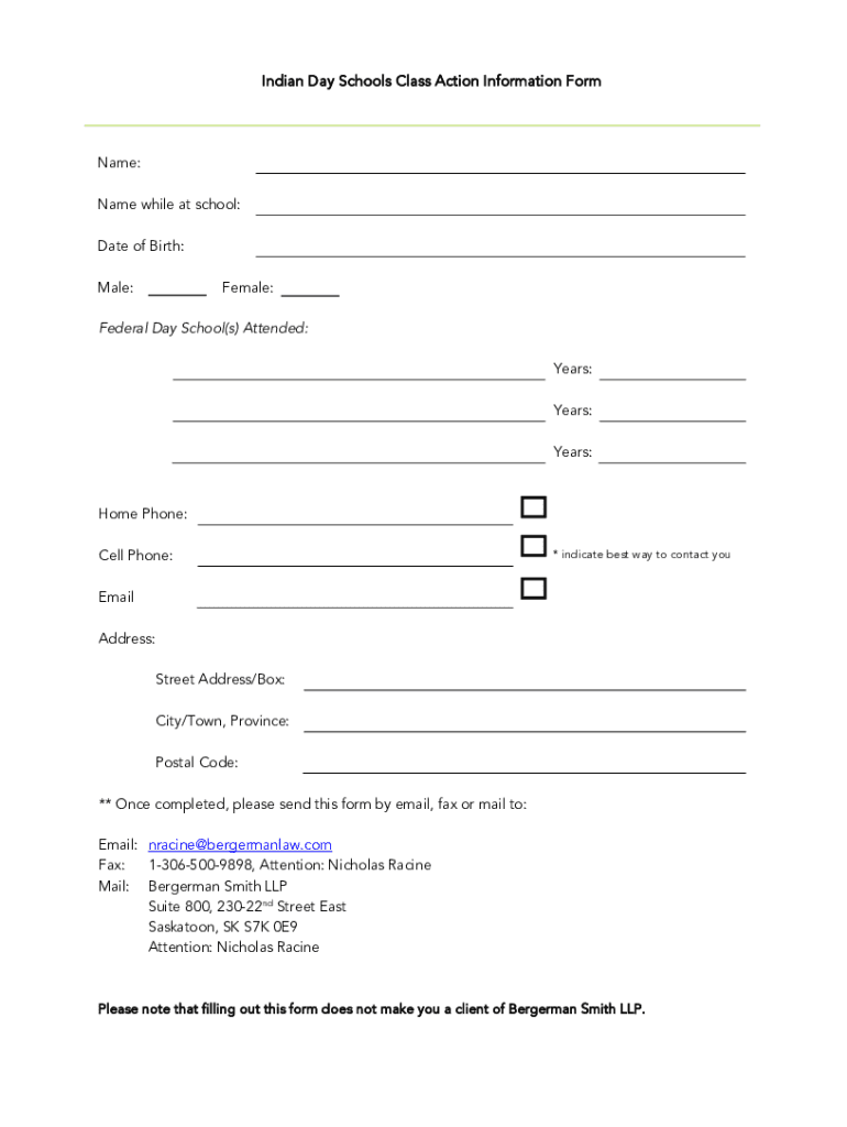Indian Day Schools Class Action Information Forename: Name while at school: Date of Birth: Male:Female:Federal Day School’s) Attended: Years: Years: Years:Home Phone: Cell Phone:* indicate the best