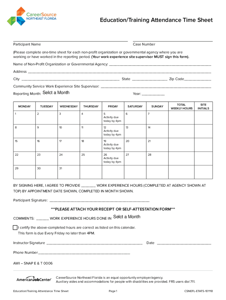 Education×Training Attendance Time SheetParticipant Name Case Number (Please complete onetime sheet for each nonprofit organization or governmental agency where you are working or have worked in