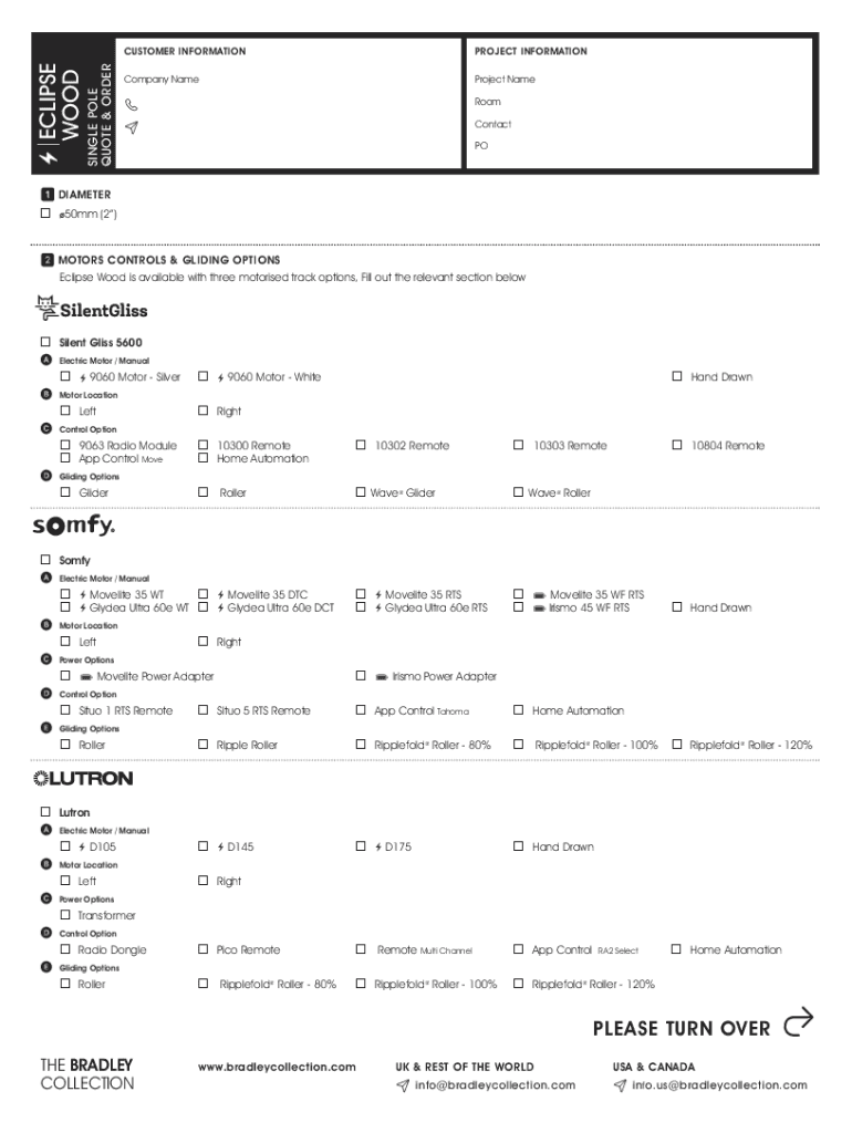 WOODPILE POLE QUOTE & ORDER×ECLIPSECUSTOMER INFORMATIONPROJECT INFORMATIONCompany NameProject NameRoomContact PO DIAMETER50mm×2) MOTORS CONTROLS & GLIDING OPTIONS Eclipse Wood is available with