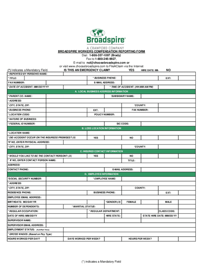 (*) Indicates a Mandatory Field. BROADS PIRE WORKERS COMPENSATION REPORTING FORM Dial: 18663571097 (Brady) Fax to 18002459927, Email to not×choosebroadspire.com or visit www.choosebroadspire.com