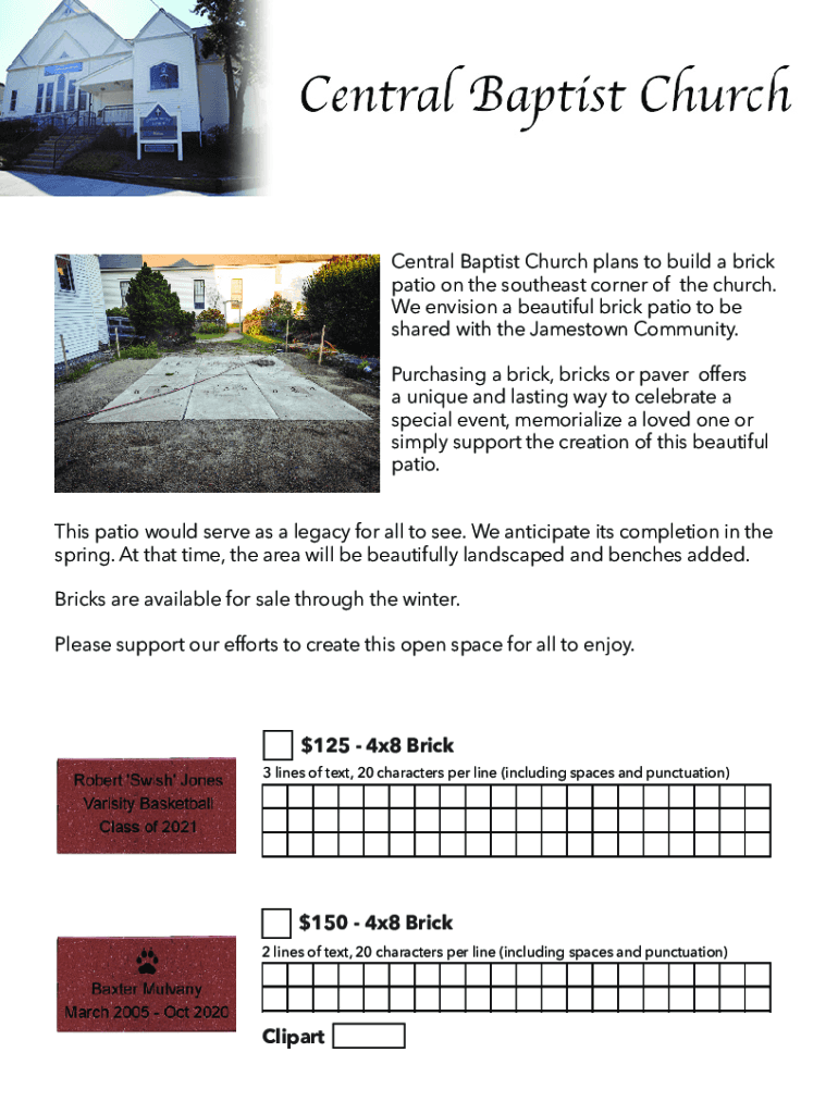 Central Baptist Church plans to build a brick patio on the southeast corner of the church. We envision a beautiful brick patio to be shared with the Jamestown Community. Purchasing a brick, bricks