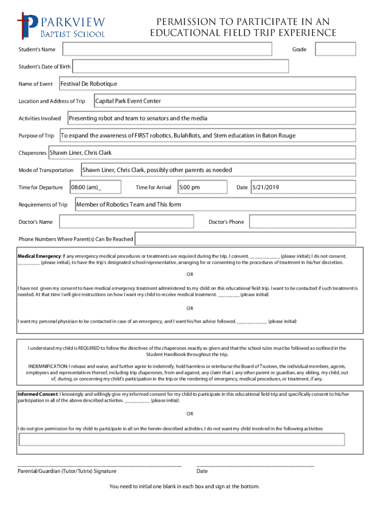 Get the free Parent Permission Form For Field Trip Participation