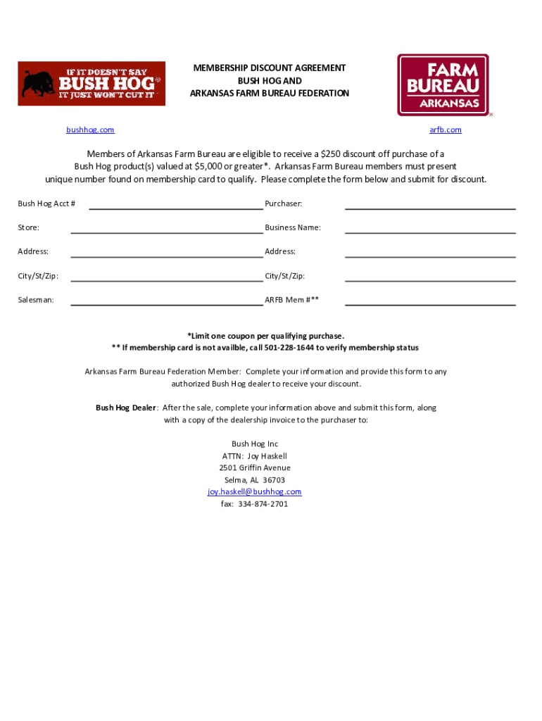 MEMBERSHIP DISCOUNT AGREEMENT BUSH HOG AND ARKANSAS FARM BUREAU FEDERATION bush hog.comarca.nonmembers of Arkansas Farm Bureau are eligible to receive a ×250 discount off purchase of a Bush Hog product’s)