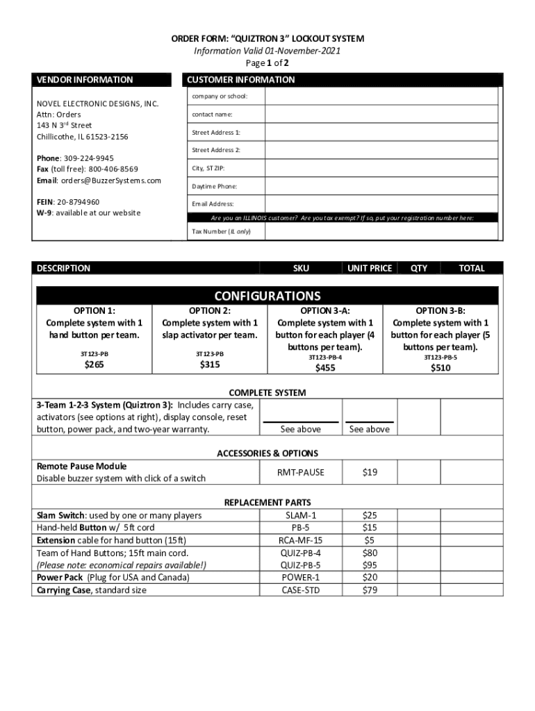 ORDER FORM: QUINTON 3 LOCKOUT SYSTEM Information Valid 01November2021 Page 1 of 2 VENDOR INFORMATIONCUSTOMER INFORMATION company or school:NOVEL ELECTRONIC DESIGNS, INC. Attn: Orders 143 N 3rd Street