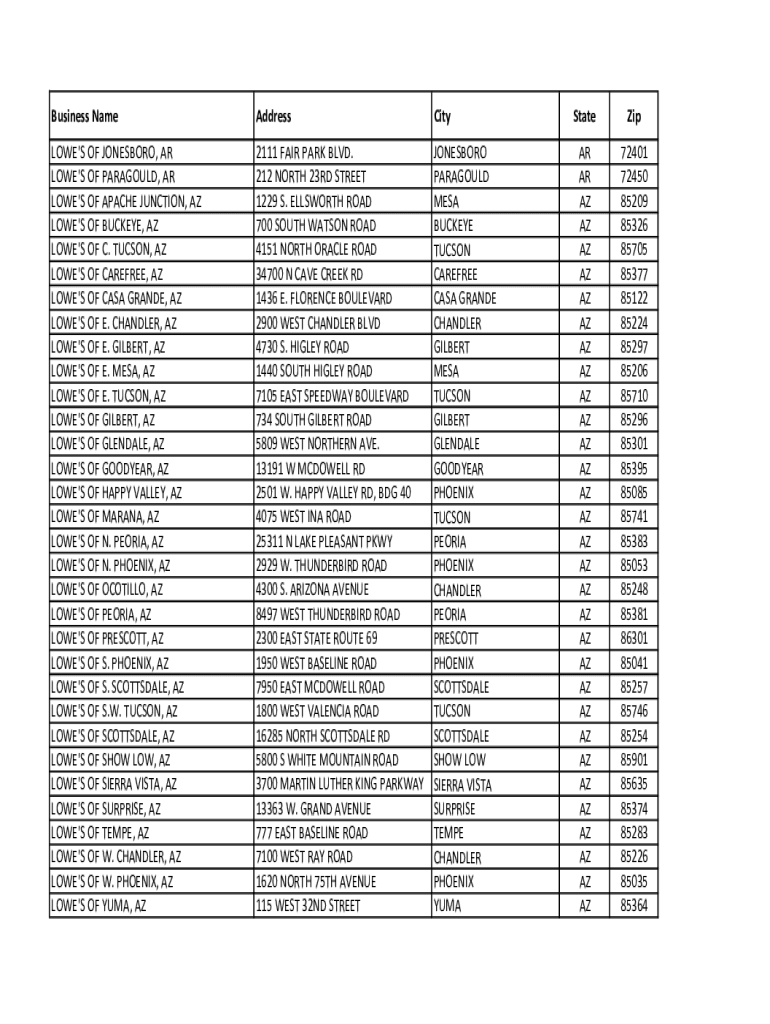 Business NameAddressCityLOWE\'S OF JONESBORO, AR LOWE\'S OF PARAGOULD, AR LOWE\'S OF APACHE JUNCTION, AZ LOWE\'S OF BUCKEYE, AZ LOWE\'S OF C. TUCSON, AZ LOWE\'S OF CAREFREE, AZ LOWE\'S OF CASA GRANDE,