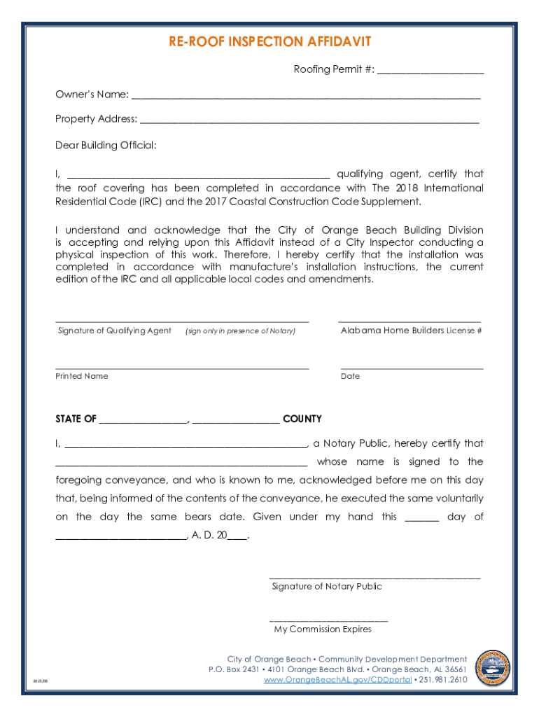REPROOF INSPECTION AFFIDAVIT Roofing Permit #: ___ Owners Name: ___ Property Address: ___ Dear Building Official: I, ___ qualifying agent, certify that the roof covering has been completed in accordance