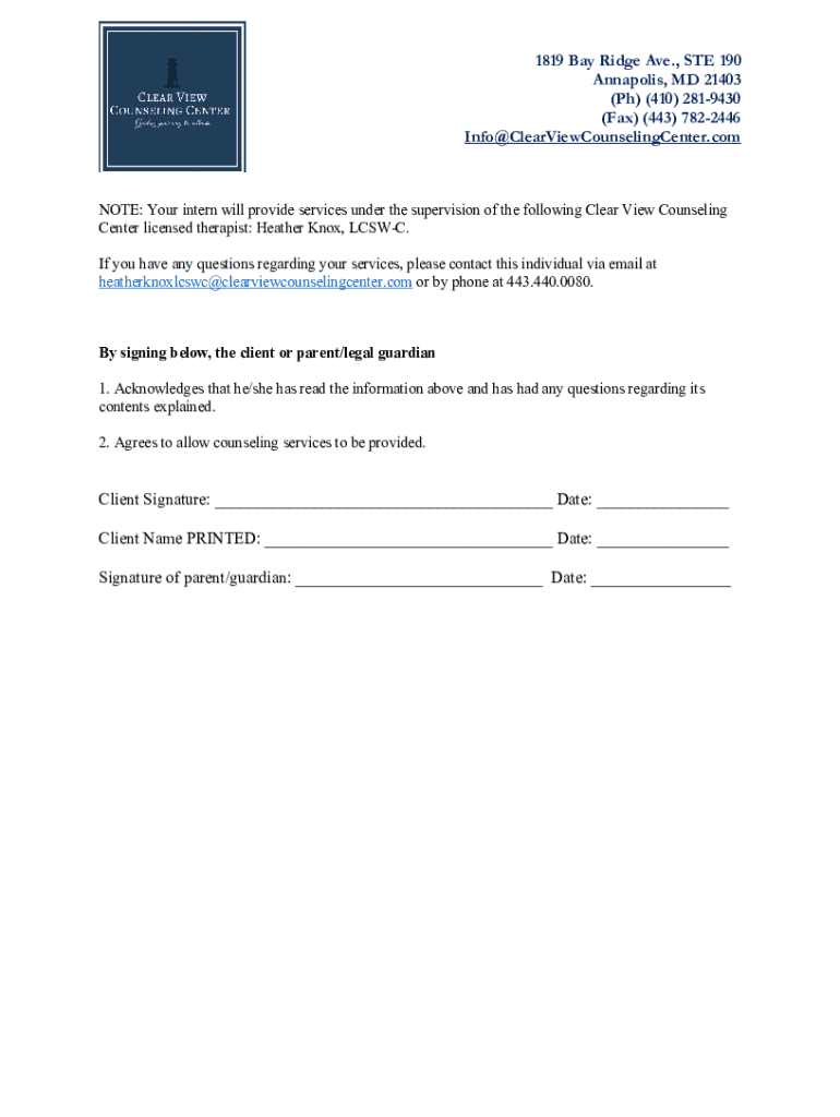 1819 Bay Ridge Ave., STE 190 Annapolis, MD 21403 (pH) (410× 2819430 (Fax) (443× 7822446 Info×ClearViewCounselingCenter.internship Disclosure and Informed Consent Client Rights and Responsibilities