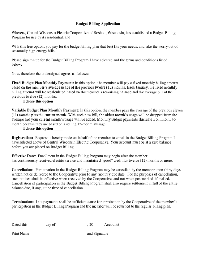 Budget Billing Application Whereas, Central Wisconsin Electric Cooperative of Reshoot, Wisconsin, has established a Budget Billing Program for use by its residential, and With this free option, you