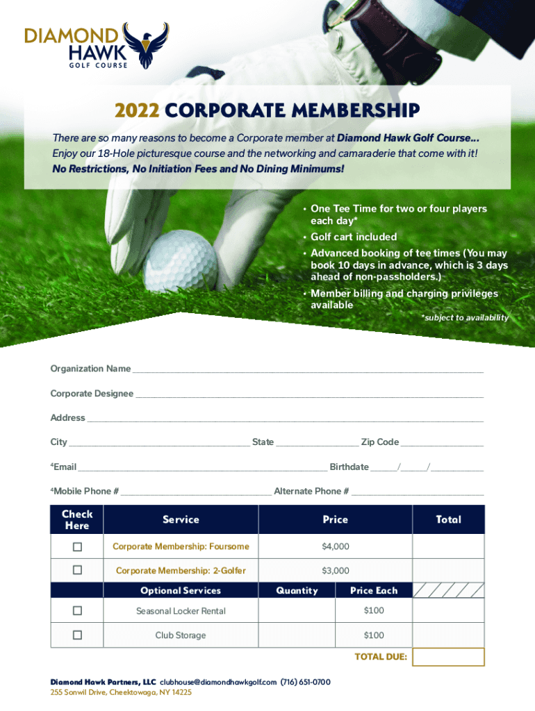 2022 CORPORATE MEMBERSHIP There are so many reasons to become a Corporate member at Diamond Hawk Golf Course... Enjoy our 18Hole picturesque course and the networking and camaraderie that come with