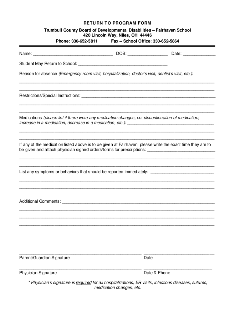 RETURN TO PROGRAM FORM Trumbull County Board of Developmental Disabilities Fair haven School 420 Lincoln Way, Nile's, OH 44446 Phone: 3306525811 Fax School Office: 3306525864 Name: ___ DOB: ___ Date: