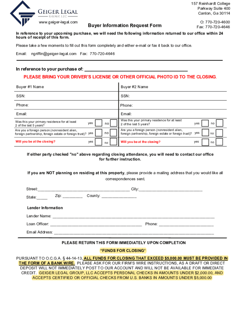157 Reinhardt College Parkway Suite 400 Canton, Ga 30114 www.geigerlegal.comBuyer Information Request Form: 7707204600 Fax: 7707204646In reference to your upcoming purchase, we will need the following