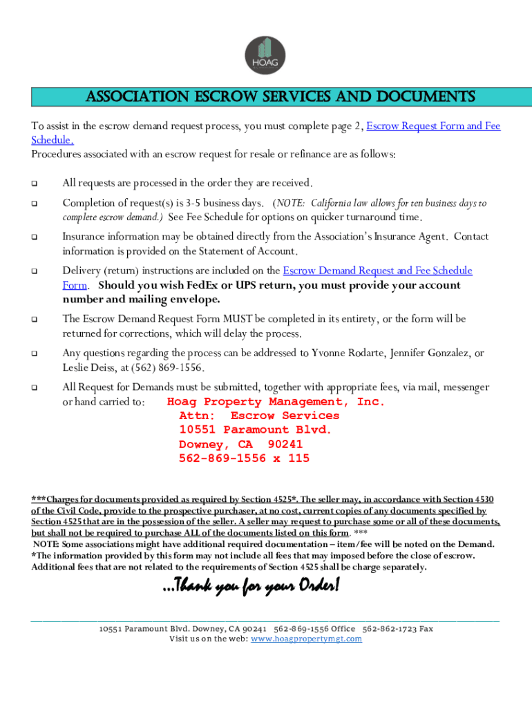 Association Escrow Services and Documents To assist in the escrow demand request process, you must complete page 2, Escrow Request Form and Fee Schedule. Procedures associated with an escrow request