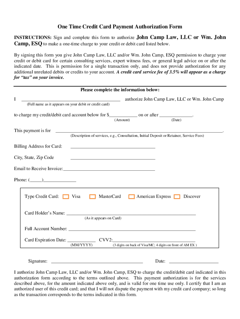 One Time Credit Card Payment Authorization Form INSTRUCTIONS: Sign and complete this form to authorize John Camp Law, LLC or Wm. John Camp, ESQ to make a onetime charge to your credit or debit card