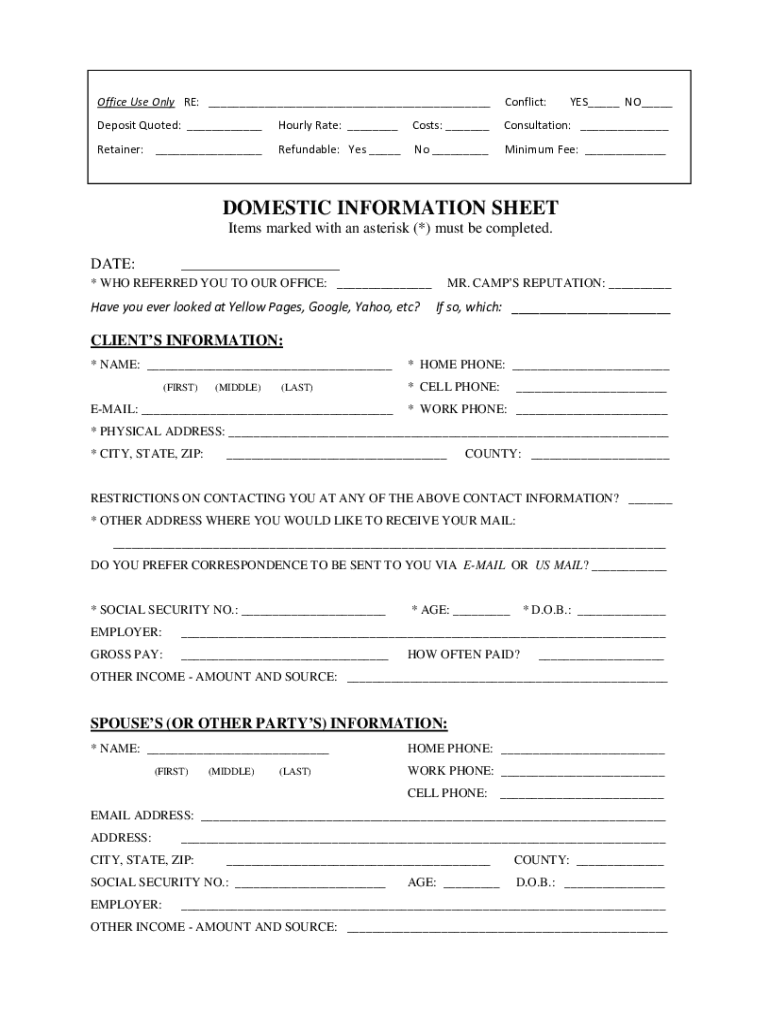 Office Use Only RE: ___Conflict:YES___ NO___Deposit Quoted: ___Hourly Rate: ___Costs: ___Consultation: ___Retainer: ___Refundable: Yes ___No ___Minimum Fee: ___DOMESTIC INFORMATION SHEET Items marked