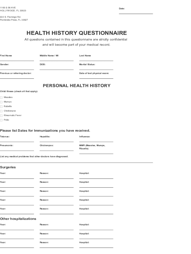 1100 S 56 AVE HOLLYWOOD, FL 33023Date:222 S. Flamingo Rd. Pembroke Pines, FL 33027HEALTH HISTORY QUESTIONNAIRE All questions contained in this questionnaire are strictly confidential and will become