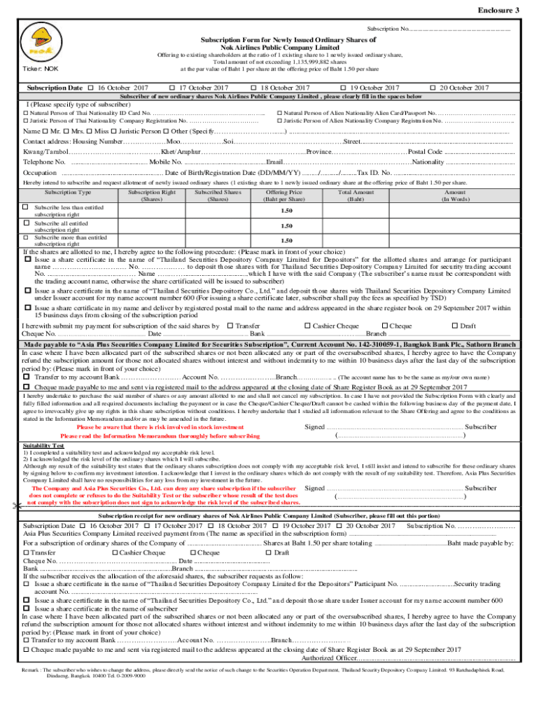 Enclosure 3 Subscription No................................................................. Subscription Form for Newly Issued Ordinary Shares of NOK Airlines Public Company Limited Offering to existing
