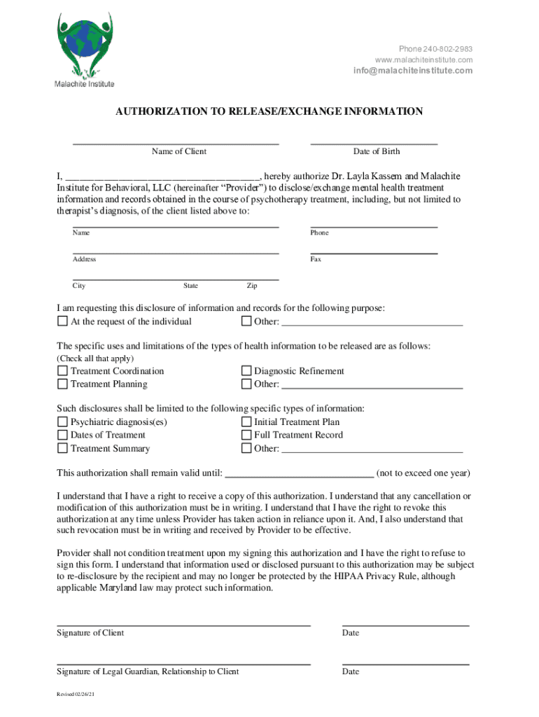 Phone 2408022983 www.malachiteinstitute.cominfo×malachite institute. Authorization TO RELEASE×EXCHANGE Informational of Clientele of Birth, ___, hereby authorize Dr. Layla Kassel and Malachite Institute