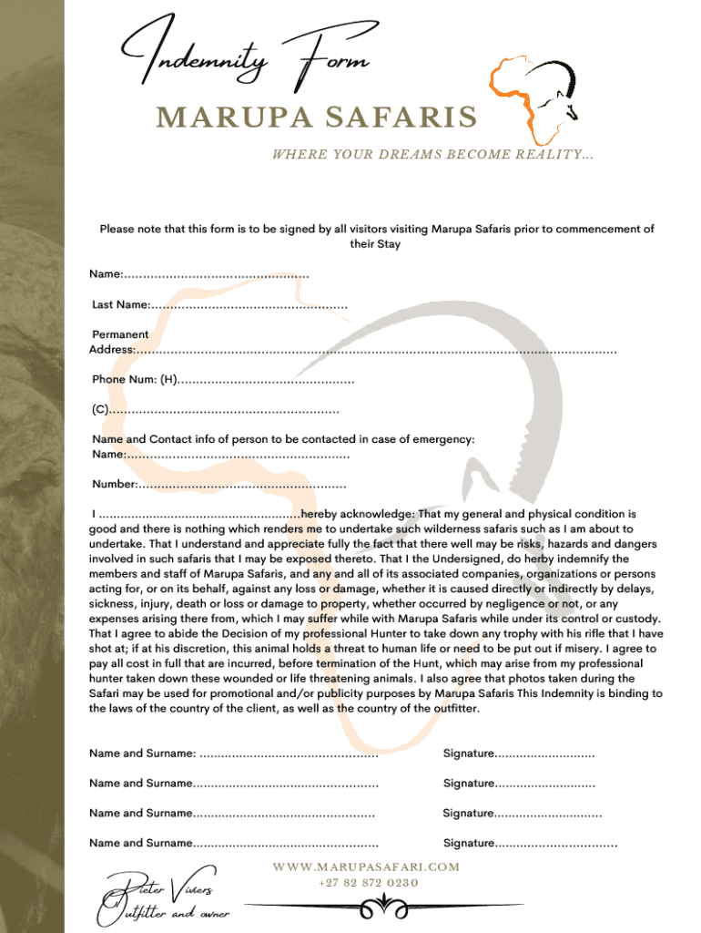 Indemnity FormMARUPA SAFARIS WHERE YOUR DREAMS BECOME REALITY... Please note that this form is to be signed by all visitors visiting Maria Safaris prior to commencement of their Stay Name:.................................................