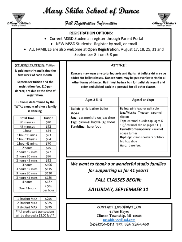Mary Skin School of Dance Fall Registration Information REGISTRATION OPTIONS: Current ESSD Students: register through Parent Portal NEW ESSD Students: Register by mail, or email ALL FAMILIES are also