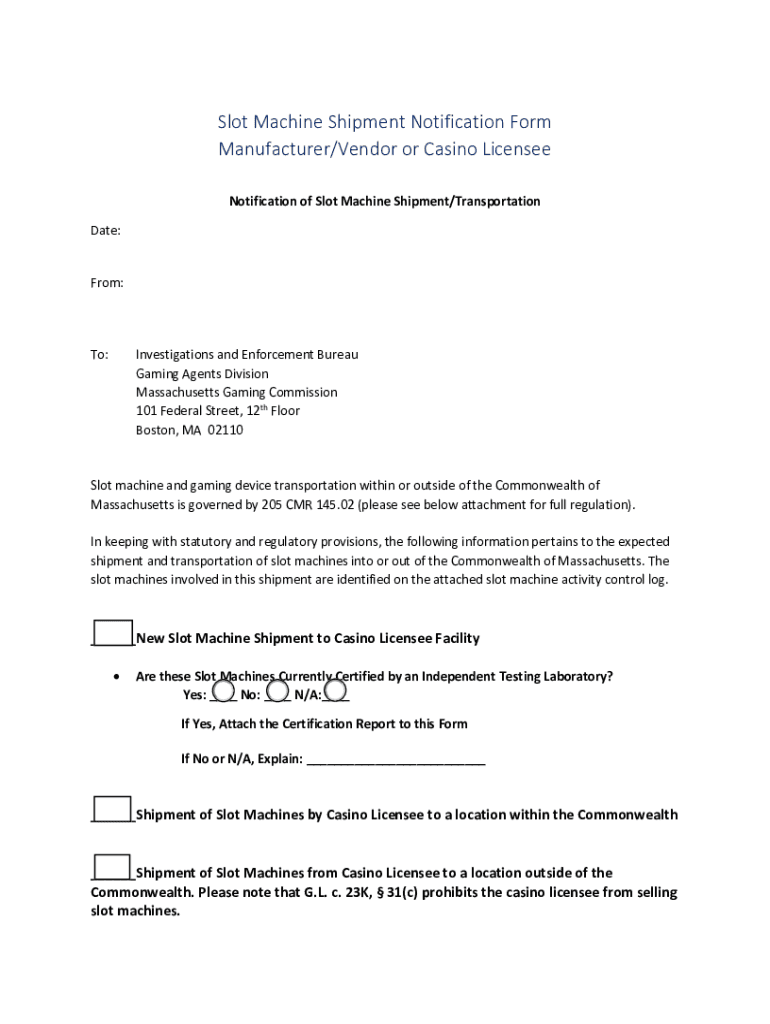 Slot Machine Shipment Notification Form Manufacturer×Vendor or Casino Licensee Notification of Slot Machine Shipment×Transportation Date: From:To:Investigations and Enforcement Bureau Gaming Agents