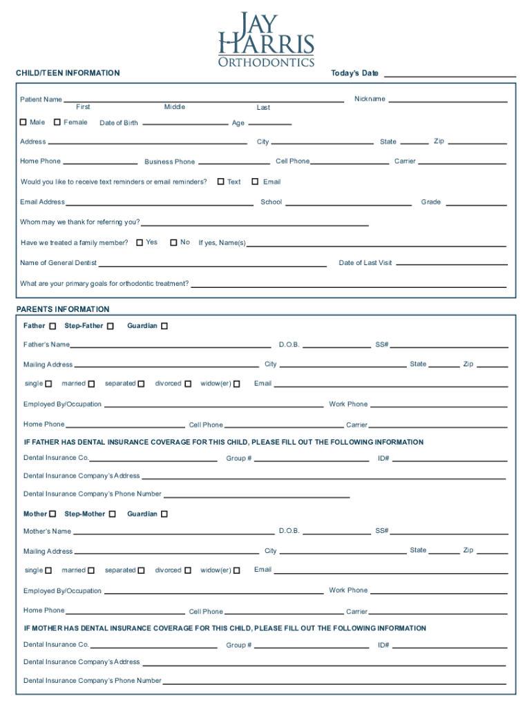 CHILD×TEEN INFORMATION Patient Name MaleTodays DateMiddleFirst FemaleNicknameLastDate of BirthAgeAddressCityHome PhoneCarrierCell PhoneBusiness PhoneWould you like to receive text reminders or email