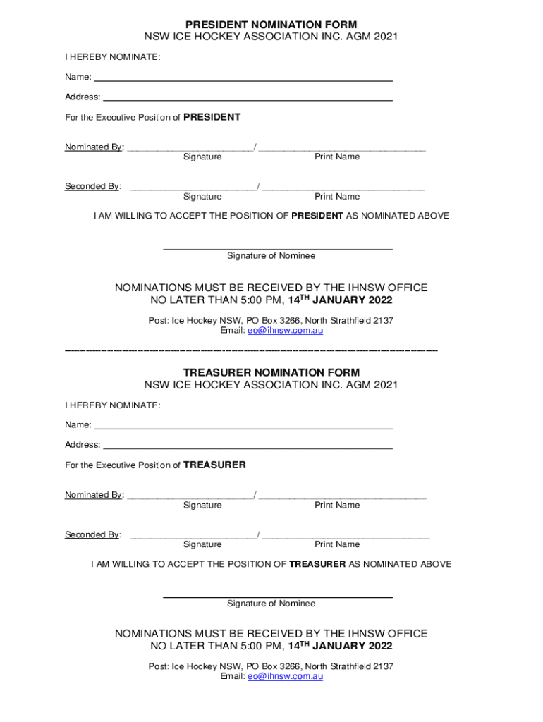 PRESIDENT NOMINATION FORM NSW ICE HOCKEY ASSOCIATION INC. AGM 2021 I HEREBY NOMINATE: Name: Address: For the Executive Position of PRESIDENTNominated By: ___/ ___ Signature Print NameSeconded By: