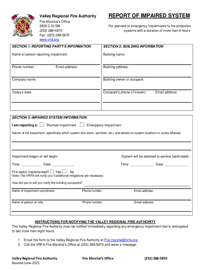 REPORT OF IMPAIRED Systemically Regional Fire Authority Fire Marshals Office 2905 C St SW (253× 2885870 Fax: (253× 2885970 www.vrfa.orgFor planned or emergency impairments to fire protection systems