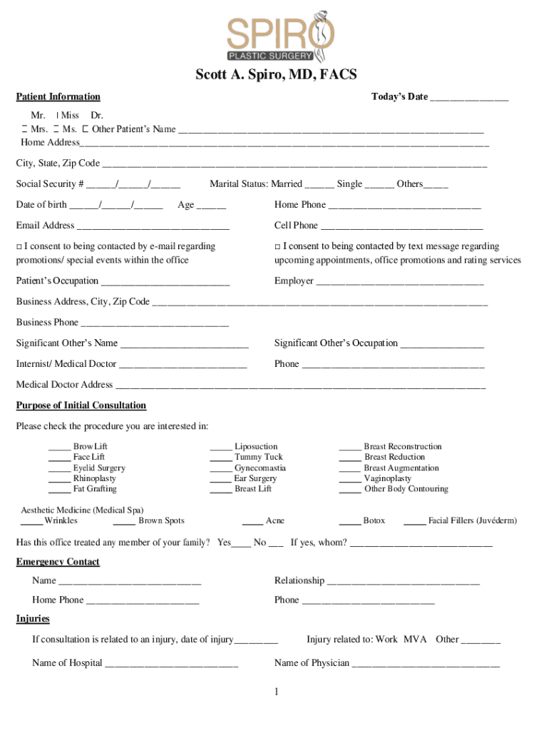 Scott A. Spiro, MD, FACS Today's Date ___Patient Information Mr. Miss Dr. Mrs. Ms. Other Patients Name ___ Home Address___ City, State, Zip Code ___ Social Security # ___/___/___ Date of birth ___/___/___Marital