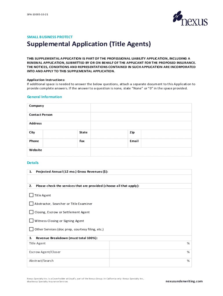 SPA100051021SMALL BUSINESS PROTECTSupplemental Application (Title Agents) THIS SUPPLEMENTAL APPLICATION IS PART OF THE PROFESSIONAL LIABILITY APPLICATION, INCLUDING A RENEWAL APPLICATION, SUBMITTED