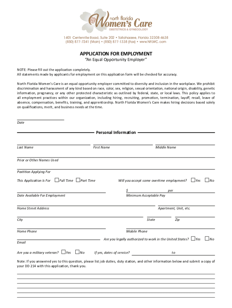 1401 Centerville Road, Suite 202 Tallahassee, Florida 323084638 ×850× 8777241 (Main) (850× 8771338 (Fax) www.NFLWC.comAPPLICATION FOR EMPLOYMENT An Equal Opportunity Employer NOTE: Please fill