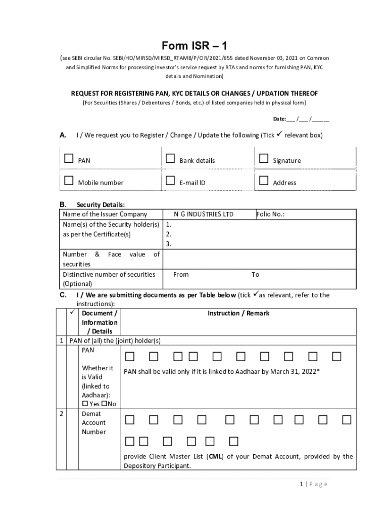 Form ISR 1 (seeSEBIcircularNo.SEMI×HO/MIRED×MIRED×RTA MB×P/CIR×2021/655datedNovember03,2021onCommon andSimplifiedNormsforprocessinginvestorsservicerequestbyRTAsandnormsforfurnishingPAN, KYC detailsandNomination)