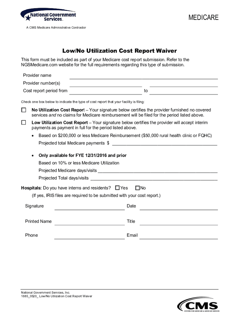 MEDICARE A CMS Medicare Administrative Contractor×No Utilization Cost Report Waiver This form must be included as part of your Medicare cost report submission. Refer to the NGSMedicare.com website