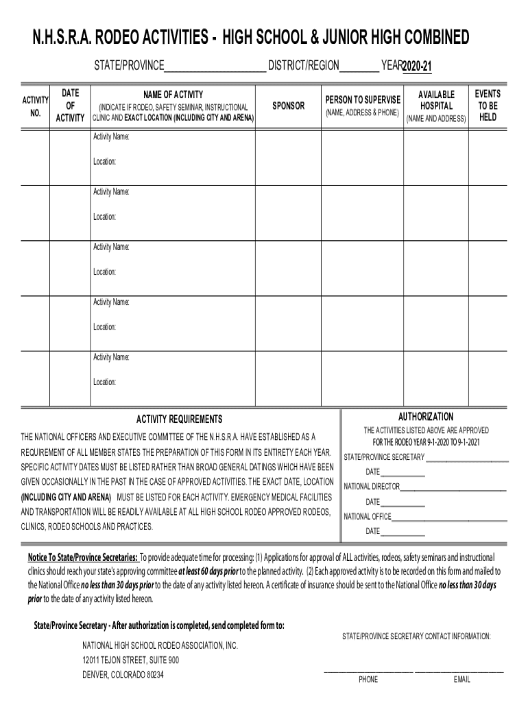 N.H.S.R.A. RODEO ACTIVITIES HIGH SCHOOL & JUNIOR HIGH COMBINED STATE×PROVINCE___ DISTRICT×REGION___ YEAR202021 ACTIVITY NO.DATE OF ACTIVITYNAME OF ACTIVITY (INDICATE IF RODEO, SAFETY SEMINAR, INSTRUCTIONAL