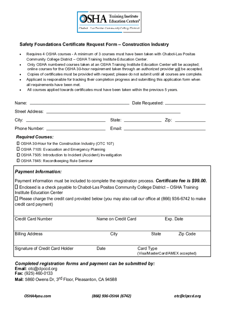 Safety Foundations Certificate Request Form Construction Industry Requires 4 OSHA courses A minimum of 3 courses must have been taken with Chablis Posits Community College District OSHA Training Institute