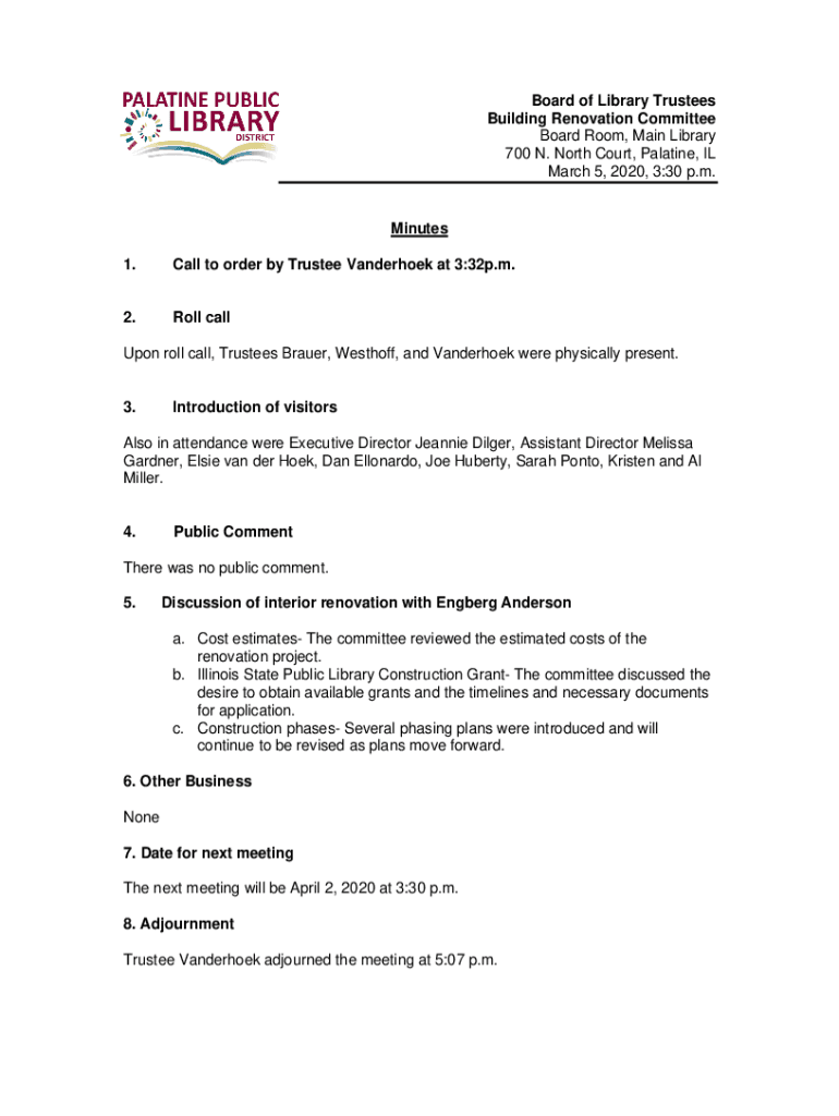 Board of Library Trustees Building Renovation Committee Board Room, Main Library 700 N. North Court, Palatine, IL March 5, 2020, 3:30 p.m. Minutes 1. Call to order by Trustee Vanderhoek at 3:32p.m.2.