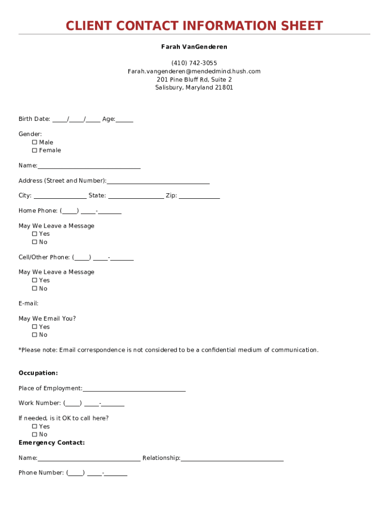 CLIENT CONTACT INFORMATION SHEET Farah Engendered (410× 7423055 Farah. Engendered×mended mind.hush.com 201 Pine Blu Rd, Suite 2 Salisbury, Maryland 21801Birth Date: ___/___/___ Age:___ Gender: Male