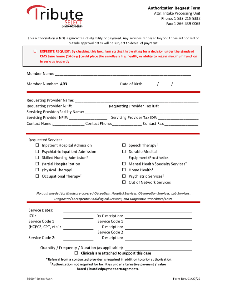 Authorization Request Form Attn: Intake Processing Unit Phone: 18332159332 Fax: 18664390065 This authorization is NOT a guarantee of eligibility or payment. Any services rendered beyond those authorized
