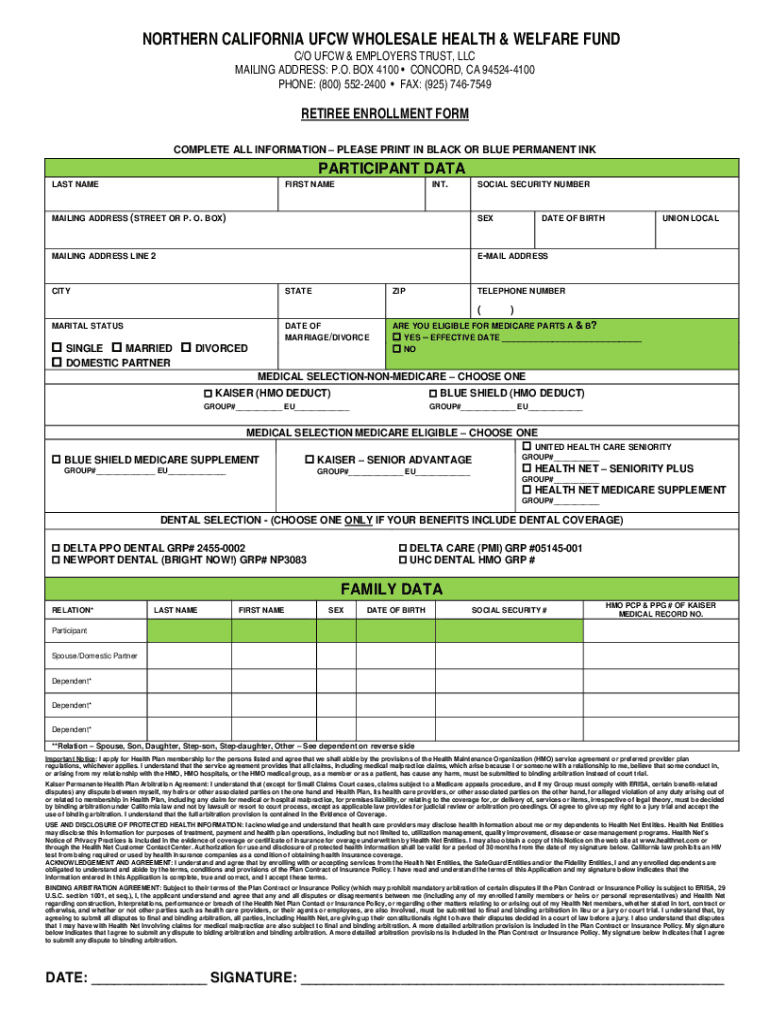 NORTHERN CALIFORNIA FCW WHOLESALE HEALTH & WELFARE FUND C×O FCW & EMPLOYERS TRUST, LLC MAILING ADDRESS: P.O. BOX 4100 CONCORD, CA 945244100 PHONE: (800× 5522400 FAX: (925) 7467549RETIREE ENROLLMENT