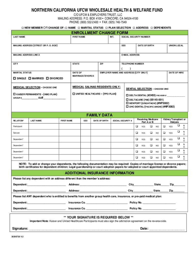 NORTHERN CALIFORNIA FCW WHOLESALE HEALTH & WELFARE FUND C×O FCW & EMPLOYERS TRUST, LLC MAILING ADDRESS: P.O. BOX 4100 CONCORD, CA 945244100 PHONE: (800× 5522400 FAX: (925× 7467549 NEW MEMBER OR