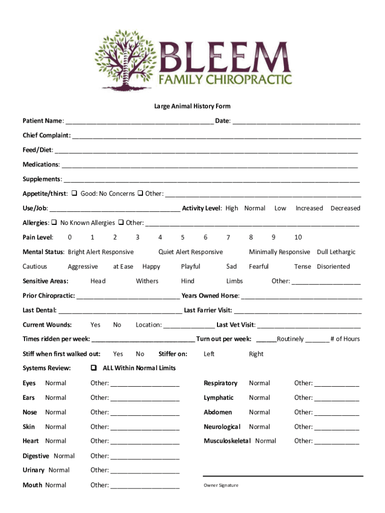 Large Animal History Form Patient Name: ___ Date: ___ Chief Complaint: ___ Feed×Diet: ___ Medications: ___ Supplements: ___ Appetite×thirst: Good: No Concerns Other: ___ Use×Job: ___ Activity Level: