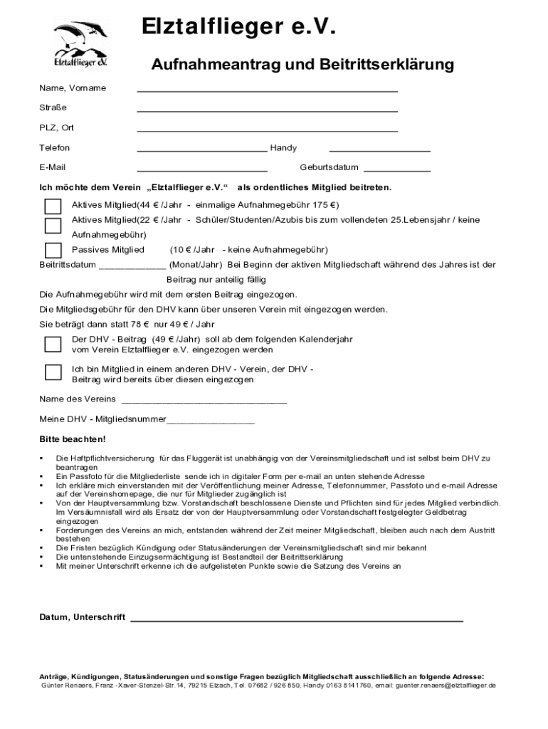 Elztalflieger e.V. Aufnahmeantrag UND Beitrittserklrung Name, Surname Straw PLY, ORT HandyTelefonGeburtsdatumEMail ICH mate them Vain Elztalflieger e.V.ALS ordentliches Mingled batten. Actives Mingled