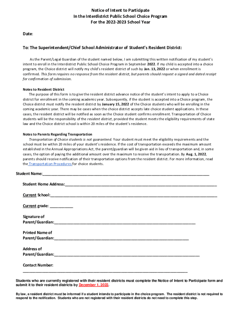 Notice of Intent to Participate In the Interdistrict Public School Choice Program For the 20222023 School Year Date: To: The Superintendent×Chief School Administrator of Students Resident District: