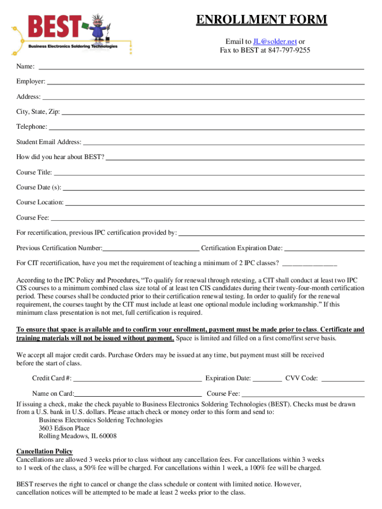 ENROLLMENT FORM Email to JR×solder.net or Fax to BEST at 8477979255 Names: Employer: Address: City, State, Zip: Telephone: Student Email Address: How did you hear about BEST? Course Title: Course